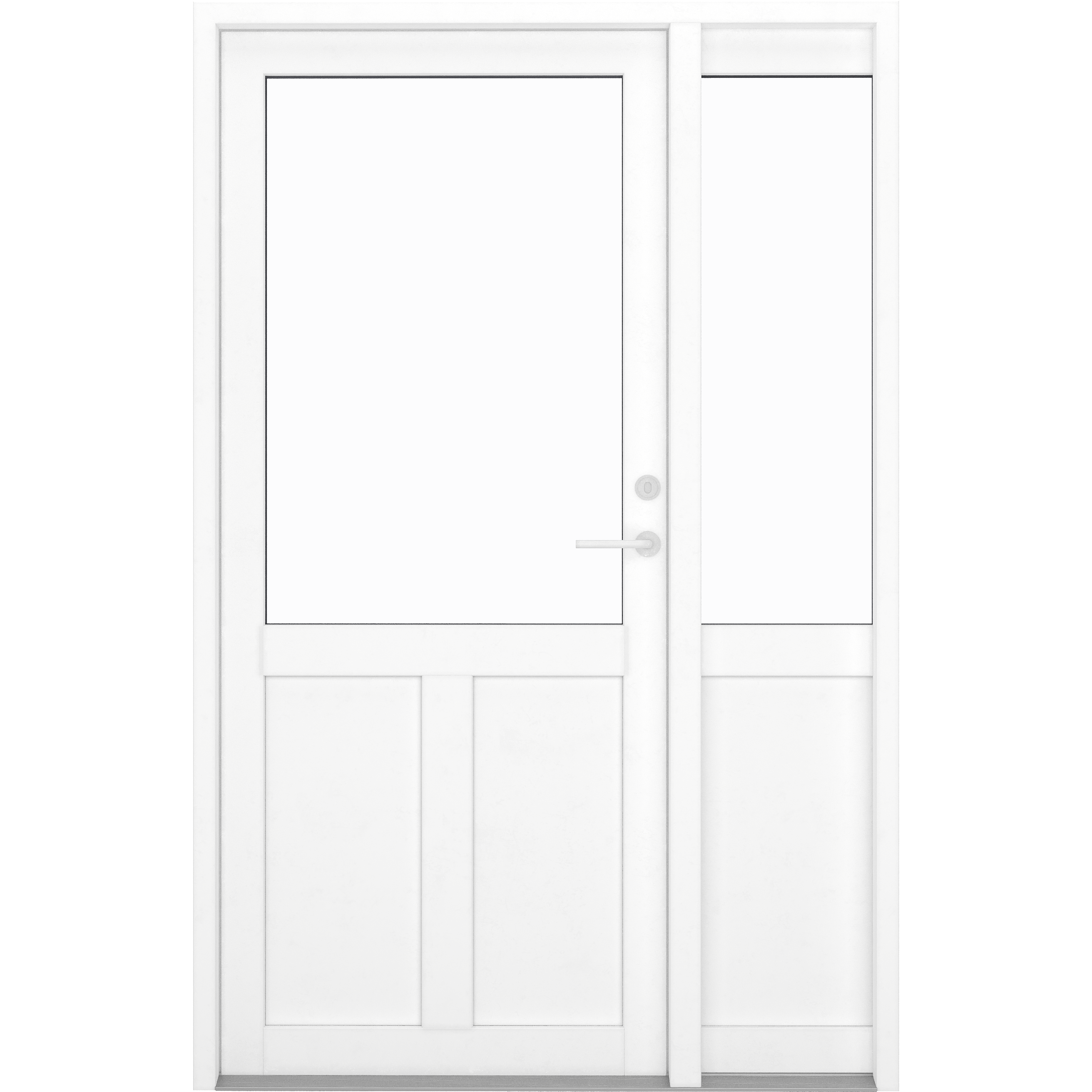 OBS: När du köper ett ytterdörrsparti är sidosektionen minst 32 cm bred och blir gradvis större beroende på bredden på hela ytterdörrspartiet. Detta måste beaktas i förhållande till dörröppningens bredd. Dessutom är sidopartiet alltid placerat på motsatt sida av dörrgångjärnen. Det vill säga gångjärnen är alltid i ramen mot väggen - inte åt sidan. Så du bestämmer på vilken sida ytterdörrspartiet är placerad när du väljer öppningsriktning. En höger utåtvänd dörr kommer till exempel att ha sidodelen på vänster sida sett från utsidan.